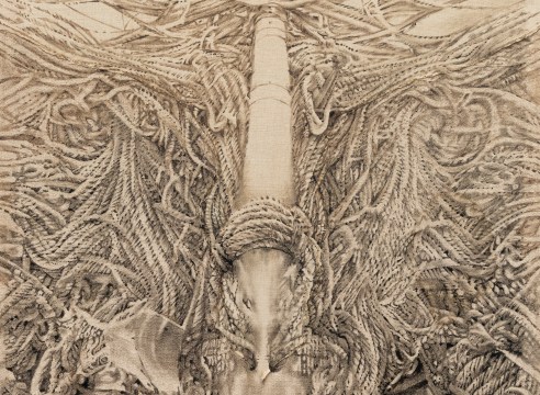 Raw, unprimed linen is integral in the work of Elaine Stocki, Lily Morris, and Hue Thi Hoffmaster. Elaine Stocki (b. 1979) stains and saturates raw linen, velvet, and denim with pigment, stitching together studio scraps that have been washed and bleached. Evoking feminist art histories in their approach, paint pools across divided areas of linen, concentrating in organic patterns. Lily Morris’s (b. 1987) Mother is a hyper-realist depiction of a ship’s mast, painted in grisaille on raw linen. The drama stems from the point of view: looking at the enormous mast from below, and the startling disconnect between a detailed rendering and the withholding of color. Huê Thi Hoffmaster (b. 1982) creates calligraphic thickets of paint across his unprimed canvases. He depicts flower forms, although they are also stand-ins for figuration. His work oscillates between abstraction and representation, Eastern and Western painting traditions.