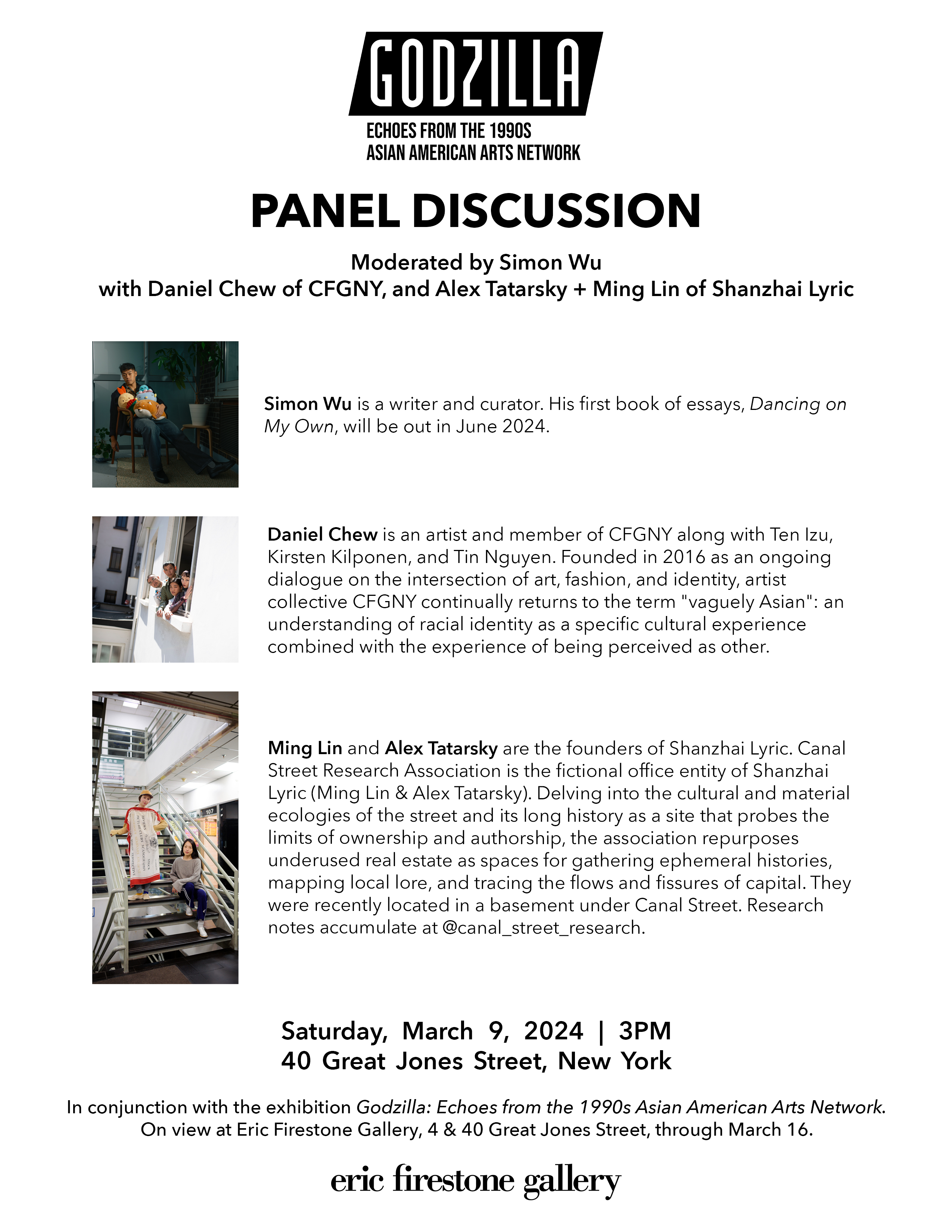 Panel discussion moderated by Simon Wu with Daniel Chew of CFGNY, and Alex Tatarsky + Ming Lin of Shanzhai Lyric. Held in conjunction with the exhibition Godzilla: Echoes from the 1990s Asian American Arts Network. On view at Eric Firestone Gallery, 4 + 40 Great Jones Street, New York, through March 16.